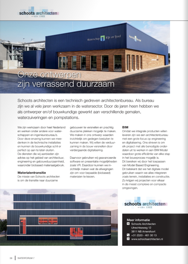 In samenwerking met NPSP Delft heeft Hoogheemraadschap De Stichtse Rijnlanden gevelpanelen ontwikkeld die gemaakt zijn van reststoffen uit de rioolwaterzuivering. Schoots Architecten zorgde voor het ontwerp van de panelen, die moeten voldoen aan strenge bouwtechnisch eisen. Als eerste wordt de gevel van een HDSR-bedrijfspand in De Meern met deze innovatieve panelen bekleed. Het pand wordt hiermee verduurzaamd en dient tegelijkertijd als praktijkvoorbeeld om marktpartijen te laten zien dat circulariteit, duurzaamheid en een technisch hoogstaand en stijlvol product goed samen kunnen gaan.